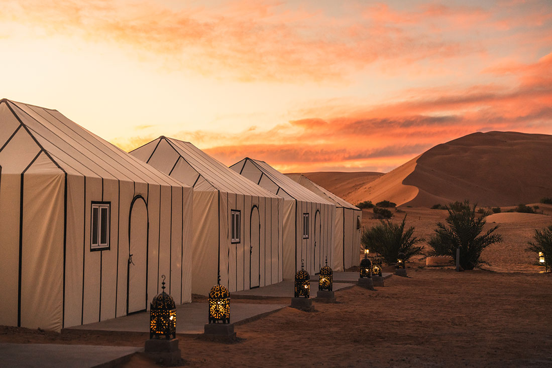 After breakfast, we will head into the Merzouga desert in a 4×4 vehicle. Along the way, we will pass through several Berber communities. A stop in the village of Khamlia allows you to listen to traditional Gnawa music. Next, we will follow the paths used by local nomads to learn about their simple lifestyle. We return to your hotel for rest and lunch with them. Afterwards, you will go on a camel excursion with your guide, who will lead you across the dunes to a desert camp for the night. Dinner is served with music under the stars.